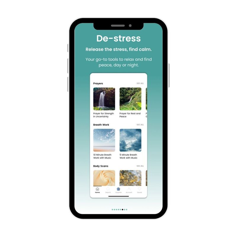 You’ll find calming prayers, guided breath work, grounding exercises, and others tools to help your body and mind slow down. All features are designed to help you breathe, refocus, and keep going.